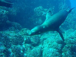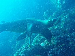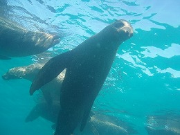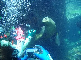 時にはグローブやフィンの先を甘噛みしてじゃれついてくるアシカも・・