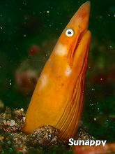 中)以前はパクパクという愛称で呼ばれていたウミヘビの仲間、いつも口をパク パク動かしています。砂から顔だけ出しているのですが全身出して泳いでい る姿は見たことないなー
