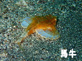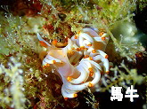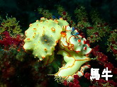 画像左)交接中のハナオトメウミウシ・・ウミウシは雌雄同体で体の右側に交尾器持っています。この交尾器をつなげてお互いの精子を交換して受精するのですよ〜