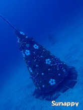 画像中)毎年バジョーンアップするIOPの水中クリスマスツリー!高さ4mほどでデコレーションも見事!奥に見える水中ポストもクリスマスバージョンに