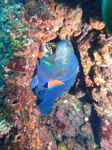 画像中)海洋公園ではよく見られるがヨコバマでは珍しいアオブダイ・・岩の隙間に入って休憩中?