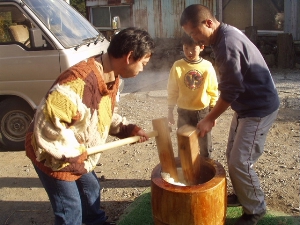 お昼は餅つき、みんなでペッタン・・大根、アンコ、お雑煮で召し上がれ